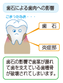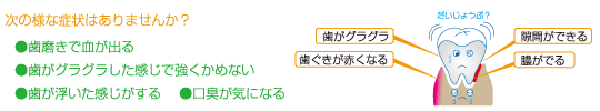 歯垢は歯を磨かないでいるとくっついてくるもので、単なる食べ残しではなく、 細菌の塊で歯垢1㎎中に数億匹の細菌が巣を作っているのです。 プラークが付いた状態で放置するとプラークは、唾液中のカルシウム成分などを取り込んで1週間ほどで石灰化して歯石を形成します。この「歯垢」や「歯石」に含まれる細菌が出す毒素によって歯肉が炎症を起こし出血や腫れを引き起こすのです。さらにはその炎症が歯を支えている骨にまで及ぶと骨が吸収され、歯がグラグラし、そして最終的に歯が抜けてしまうのです。 歯周病が悪化しやすい原因としてこのように進行する過程で重症化するまで痛みが出ることが少ないことが挙げられます。 |